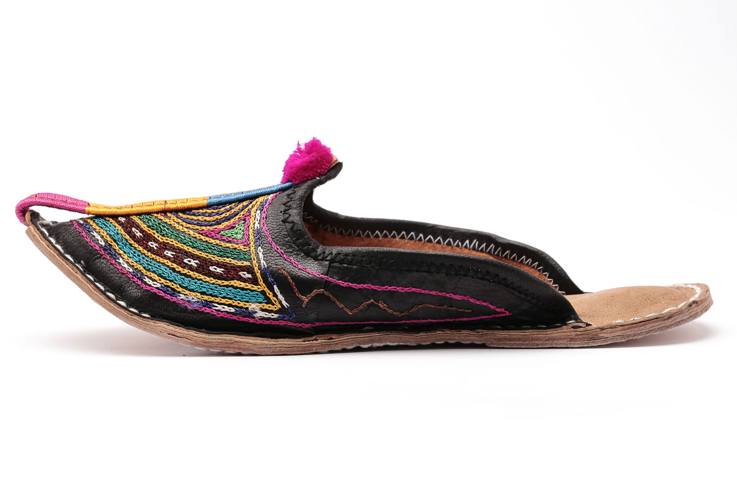 Przednia część do szpica z zachwycającym różnokolorowym haftem bezpośrednio na skórze. Charakterystyczne energetyzujące kolory. Dodatkowo buty ozdobione zostały pomponikiem. Niepowtarzalne rękodzieło z pustynnej, upalnej części Indii - Radźastanu.