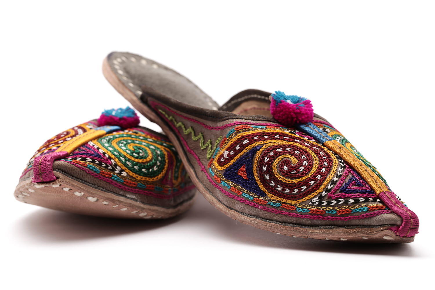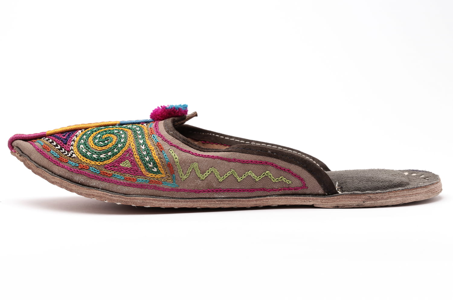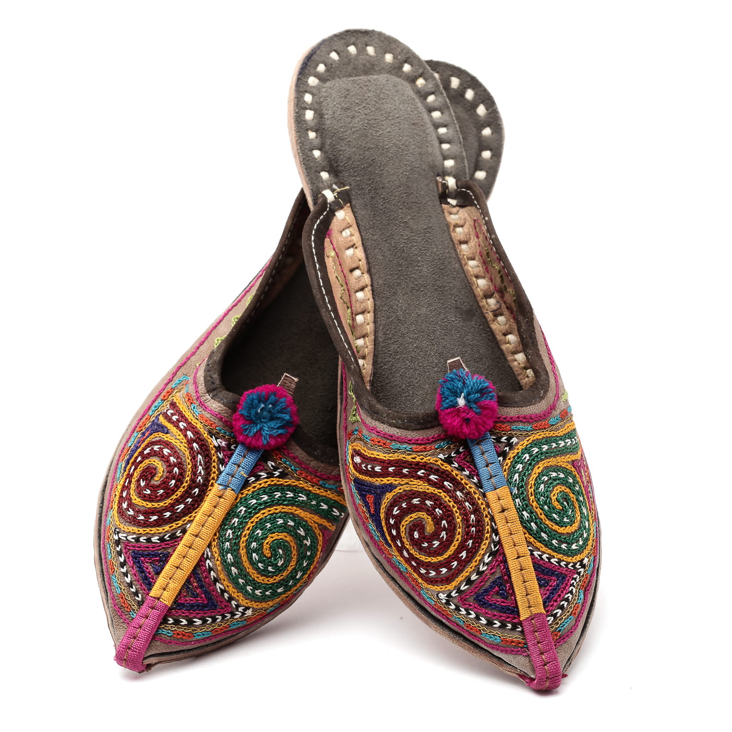 Przednia część do szpica z zachwycającym różnokolorowym haftem bezpośrednio na skórze. Charakterystyczne energetyzujące kolory. Dodatkowo buty ozdobione zostały pomponikiem. Niepowtarzalne rękodzieło z pustynnej, upalnej części Indii - Radźastanu.