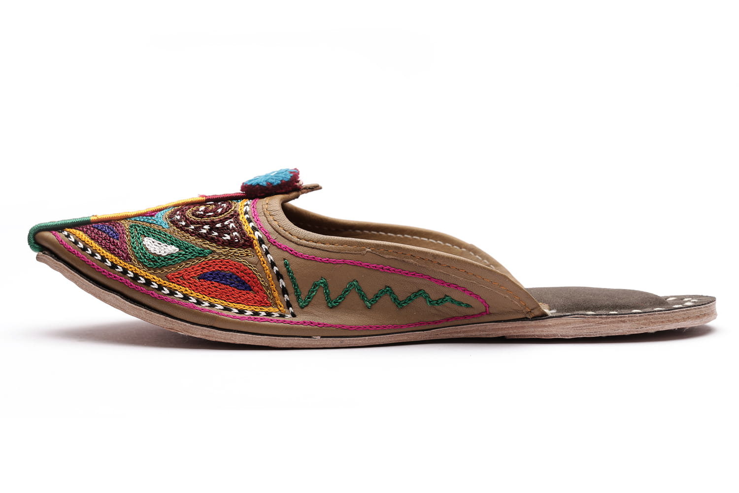 Indyjskie pantofelki damskie bez pięty jooti lub jutti. Przednia część do szpica z zachwycającym różnokolorowym haftem bezpośrednio na skórze. Charakterystyczne energetyzujące kolory. Dodatkowo buty ozdobione zostały pomponikiem. Niepowtarzalne rękodzieło z pustynnej, upalnej części Indii - Radźastanu.