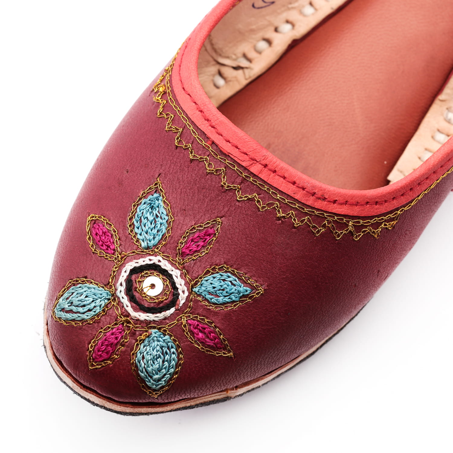 Lekkie skórzane klapki w kolorze ciemnej czerwieni z dekoracyjnym zdobieniem - połyskujący cekin zamknięty orientalnym kwiatowym haftem. Zaokrąglony, migdałowy nosek. Miękka skóra zapewni komfort noszenia.