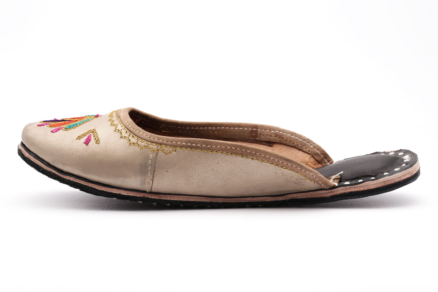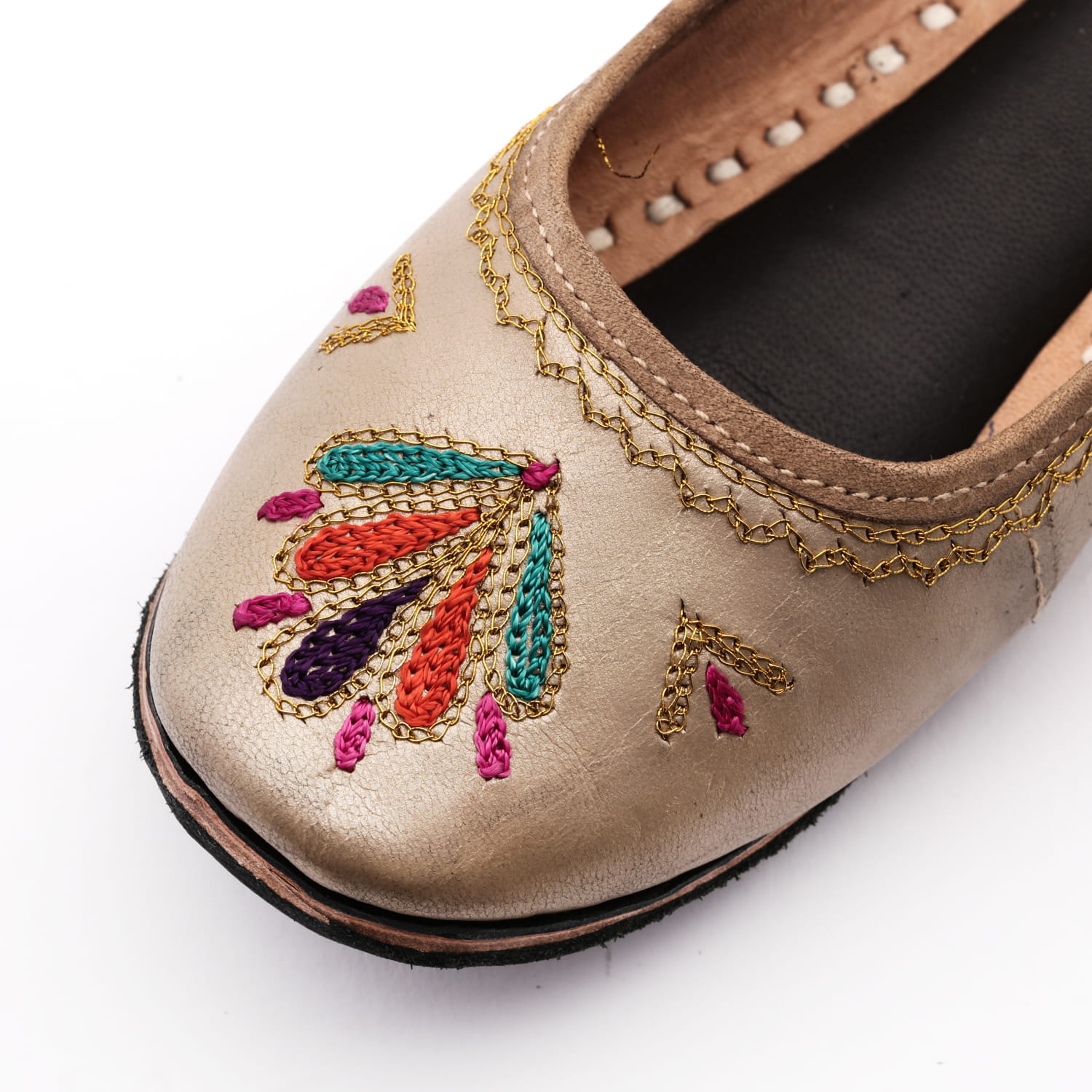 Pantofle zostały wykonane ręcznie w Indiach z miękkiej skóry koźlęcej delikatnie polerowanej. Sposób wykonana w tradycyjnych indyjskich warunkach sprawia, że pantofelki mają cechy 100% rękodzieła z Indii - przecierany, niejednolity kolor gdzieniegdzie z przyszarzeniami.