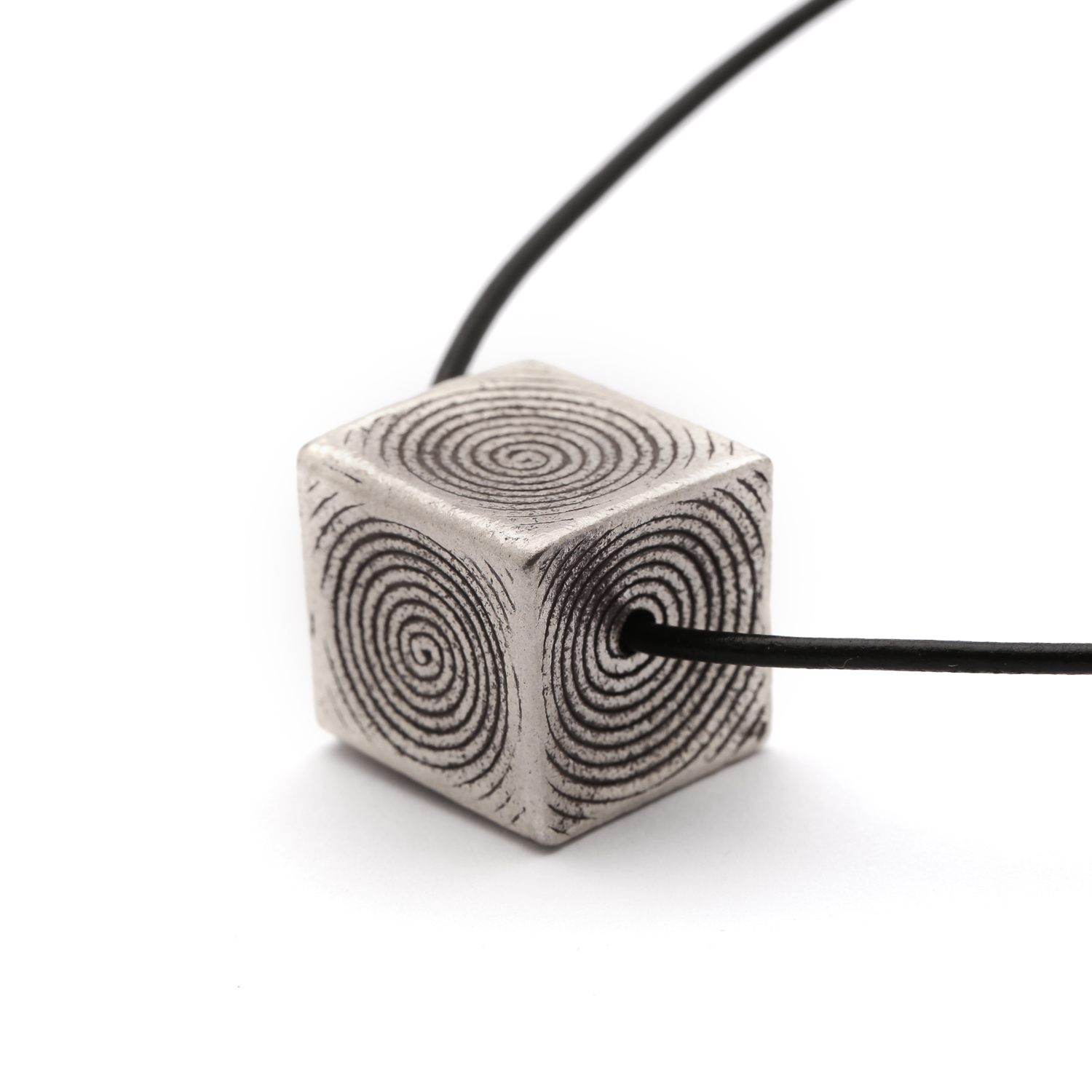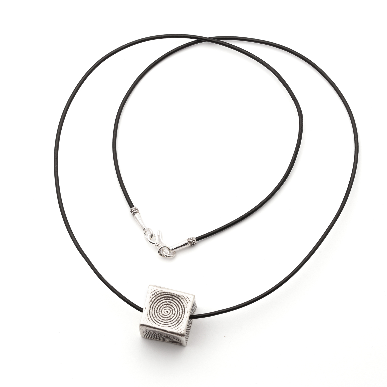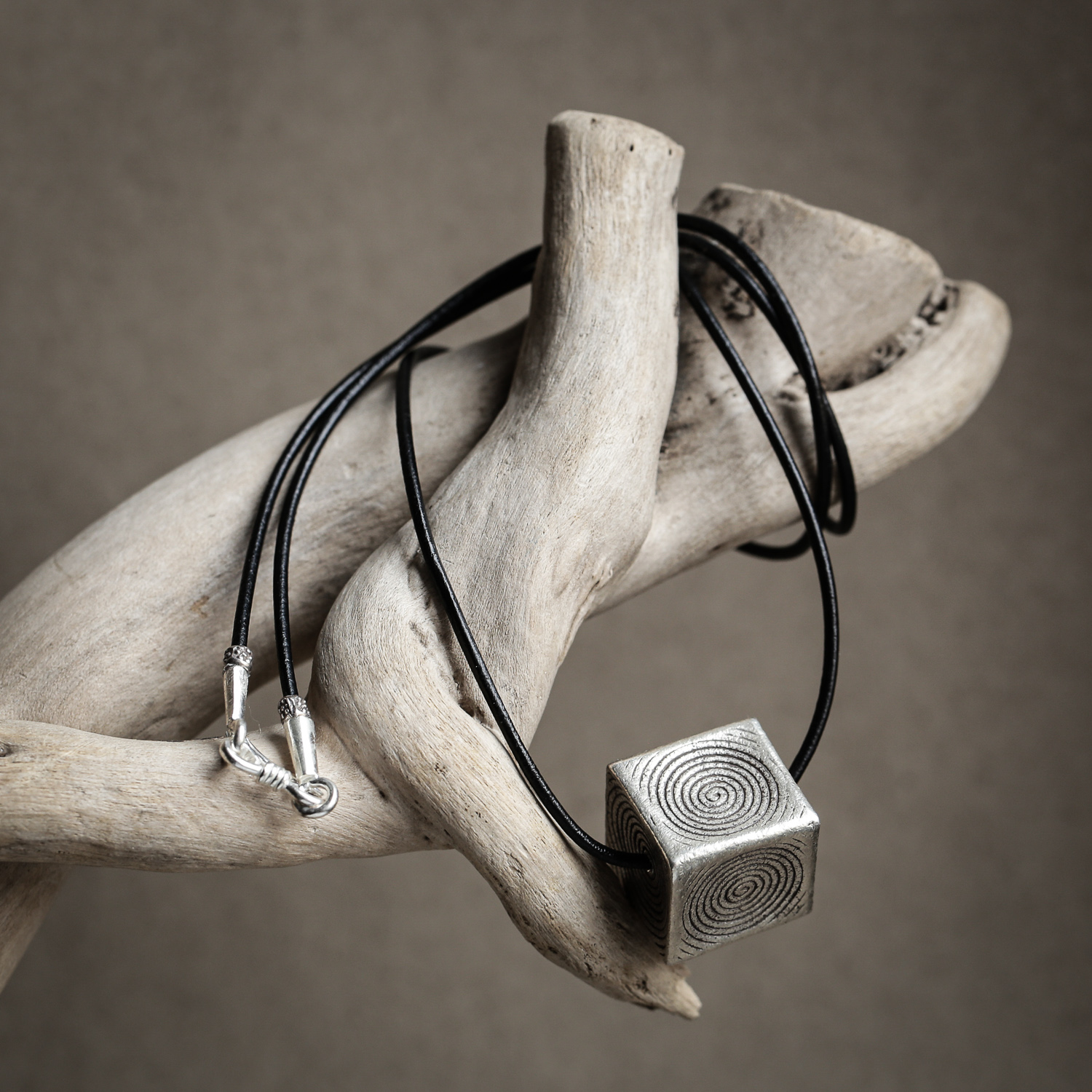 Surowy, czarny rzemień miękko układa się na skórze, prowadząc wzrok ku geometrycznej bryle — srebrnej kostce ozdobionej hipnotyzującym, spiralnym wzorem. Każda linia wygląda jak ślad czasu, jak droga bez początku i końca. To nie jest przypadkowy ornament.