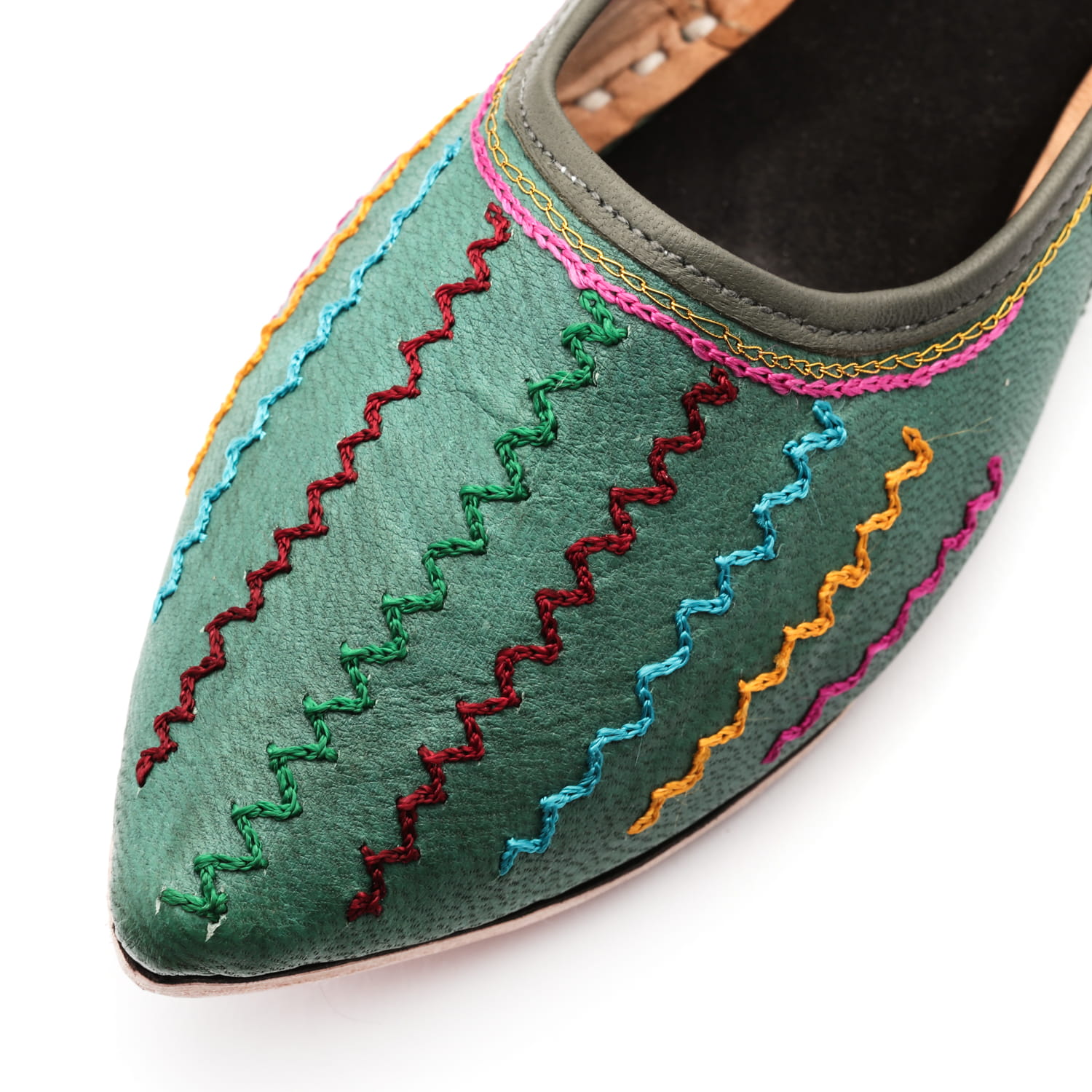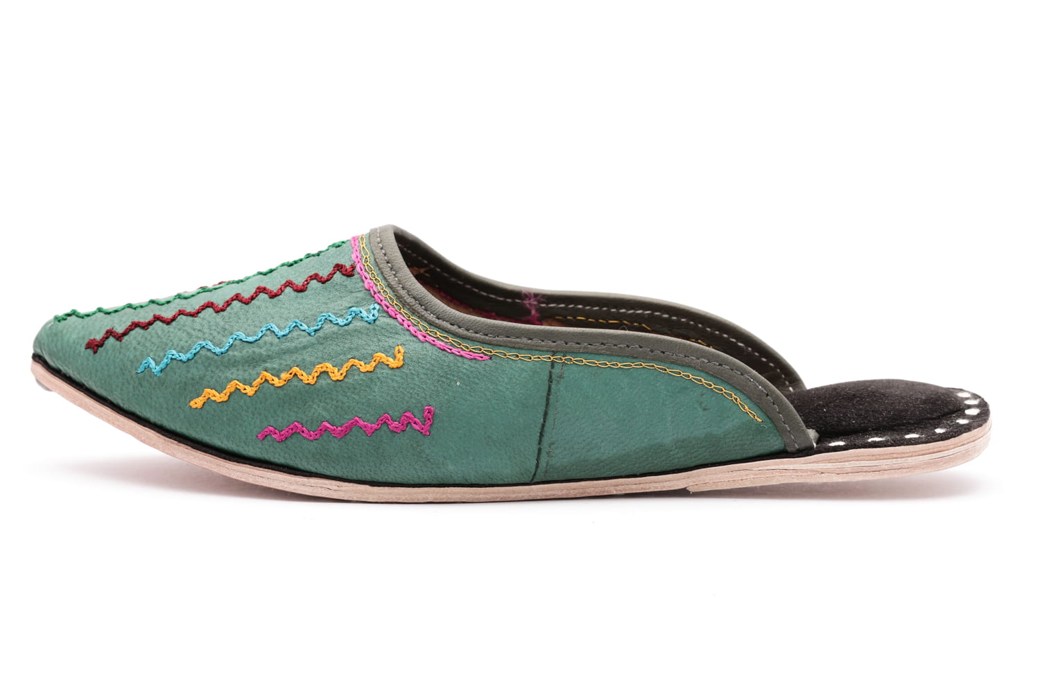 Klapki skórzane w orientalnym stylu. Kolor morskiej zieleni z ozdobnym haftem z przodu. Szpiczasty nosek. Miękka skóra zapewni komfort noszenia.