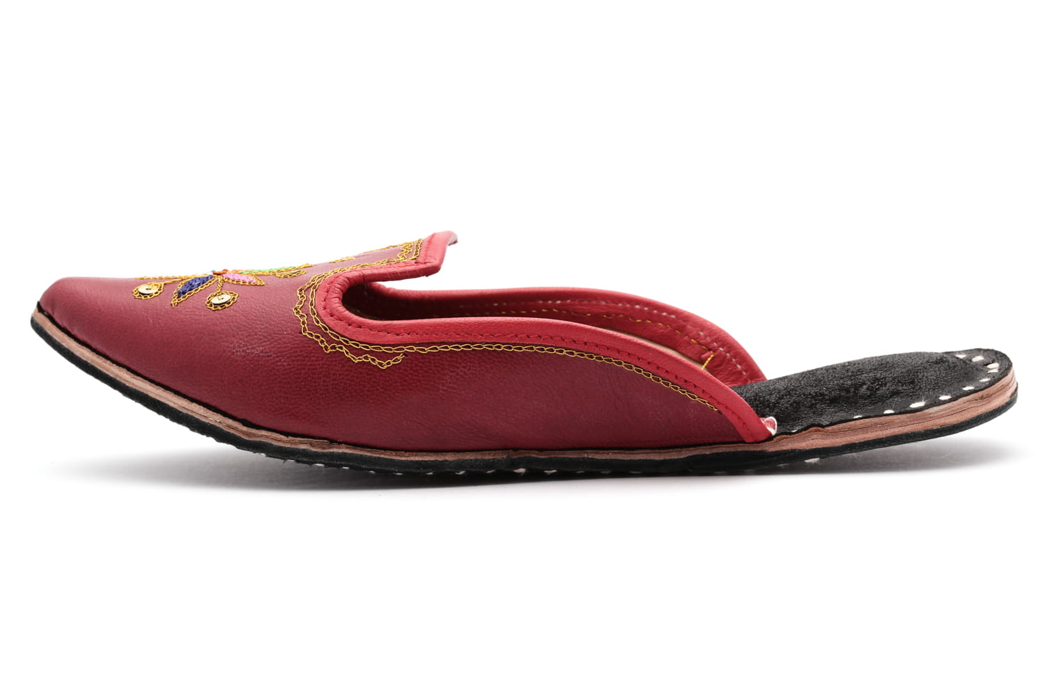 Klapki ze skóry w kolorze ciemnej czerwieni z wyszywanym zdobieniem z przodu i cekinami. Szpiczasty nosek. Miękka skóra zapewni komfort noszenia.
