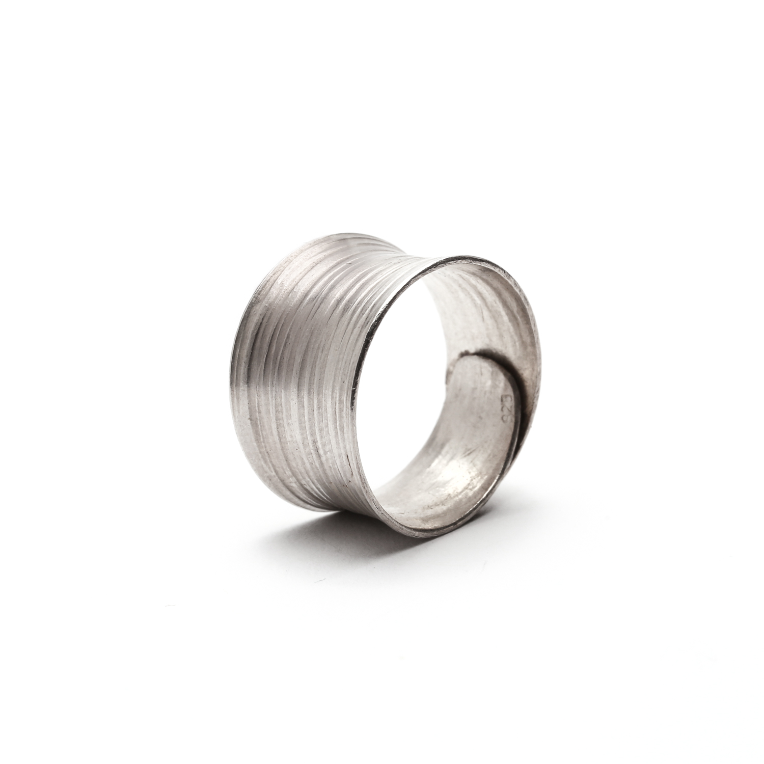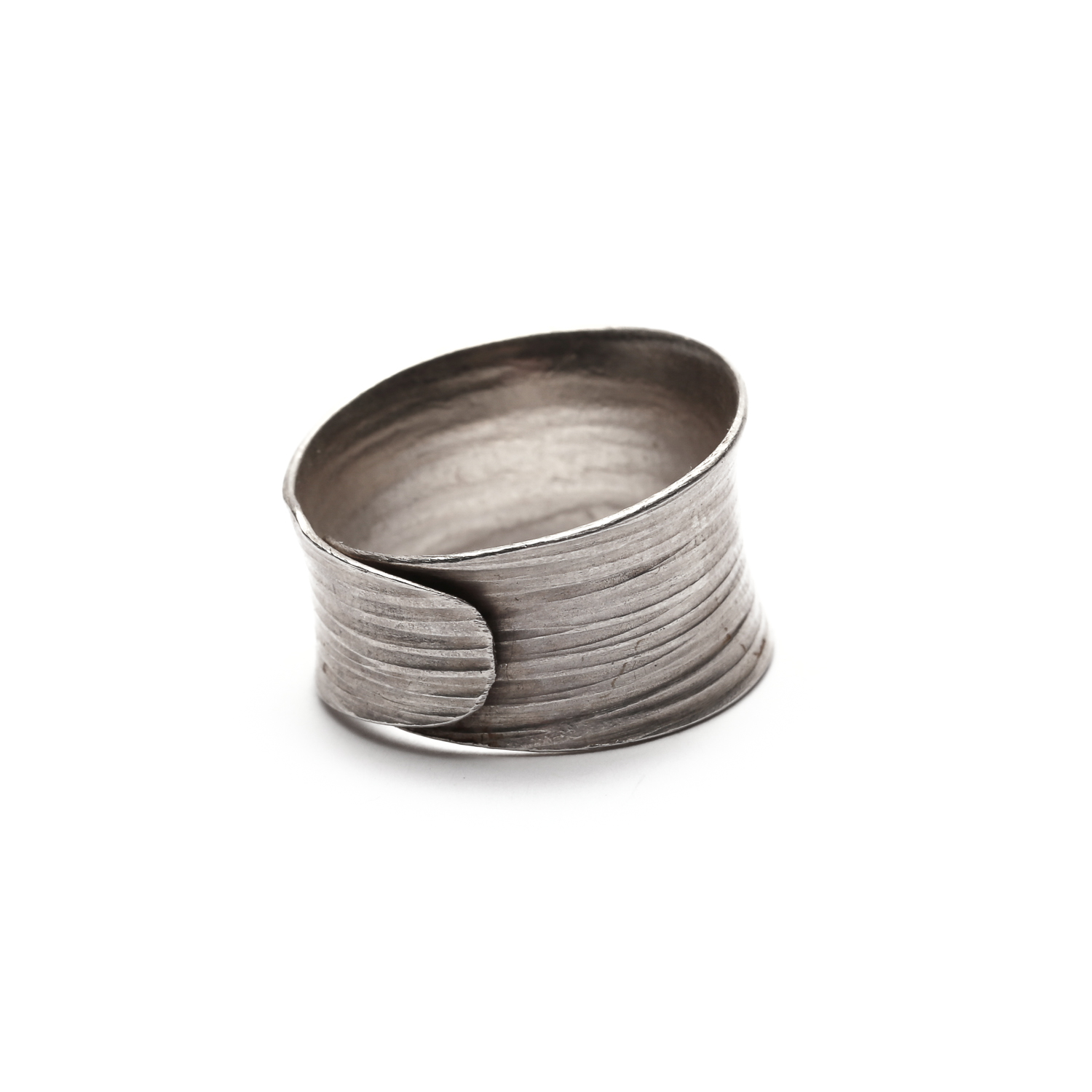 Prosty szerszy pierścionek etniczny obrączka został wykonany ze srebra próby 925. Przez częściowe oksydowanie i delikatne polerowanie uzyskano bardzo ciekawy kontrast i efekt postarzania.