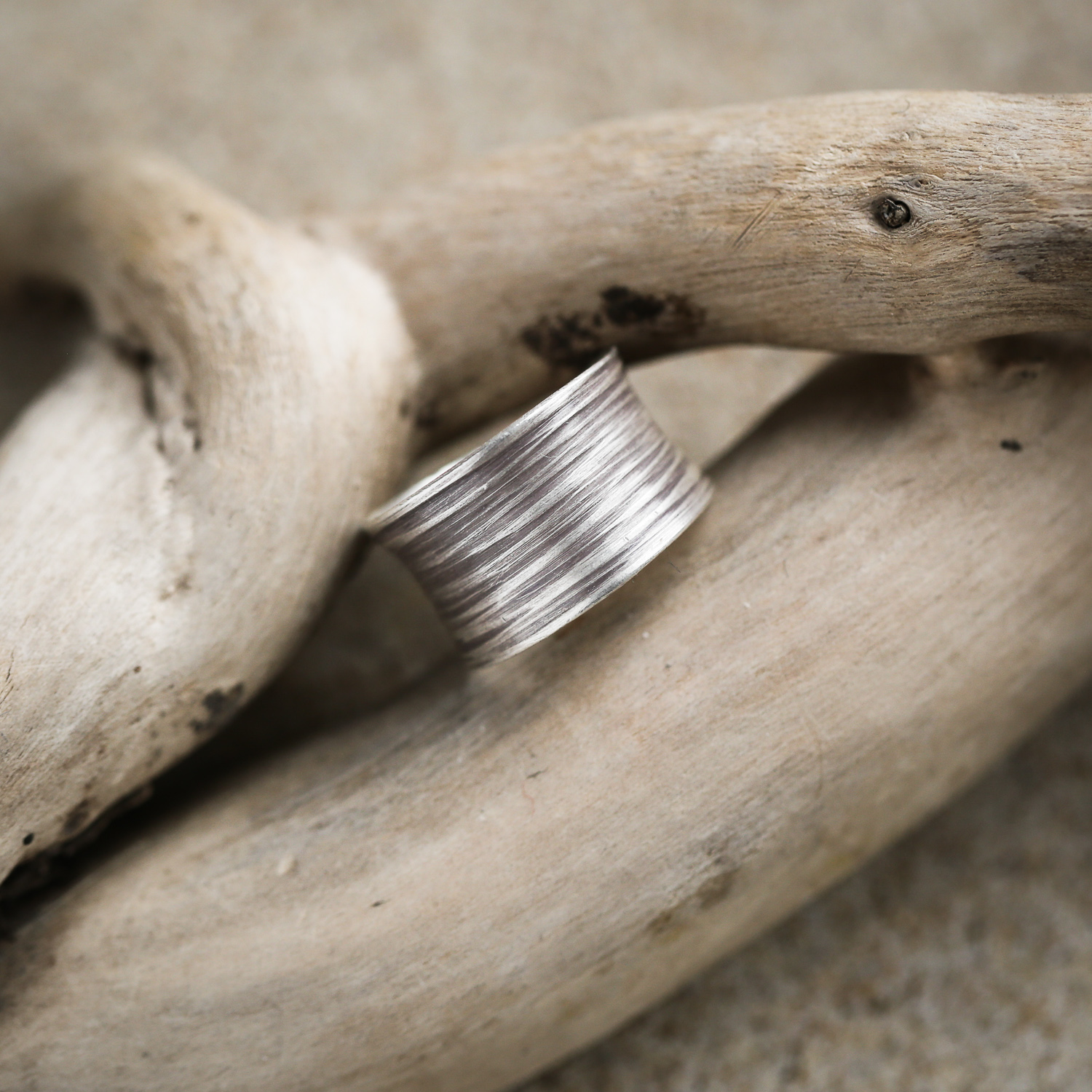 Szeroki pierścionek srebrny, obrączka w stylu etnicznym z dekoracyjną drapaną ręcznie stroną wierzchnią.